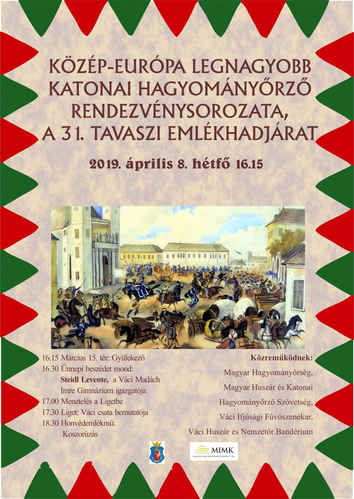 Dísszemle a Városháza előtt, csatabemutató a Hétkápolnai Honvédemlékmű mögötti ligetbe, az emlékmű megkoszorúzása Dátum: hétfő, 2019, április 8 - 16:00 - 19:00 Címkék 1848-49-es szabadságharcGyalogságLovasságTüzérségVácTavaszi Hadjáratcsatabemutatóhadijáték