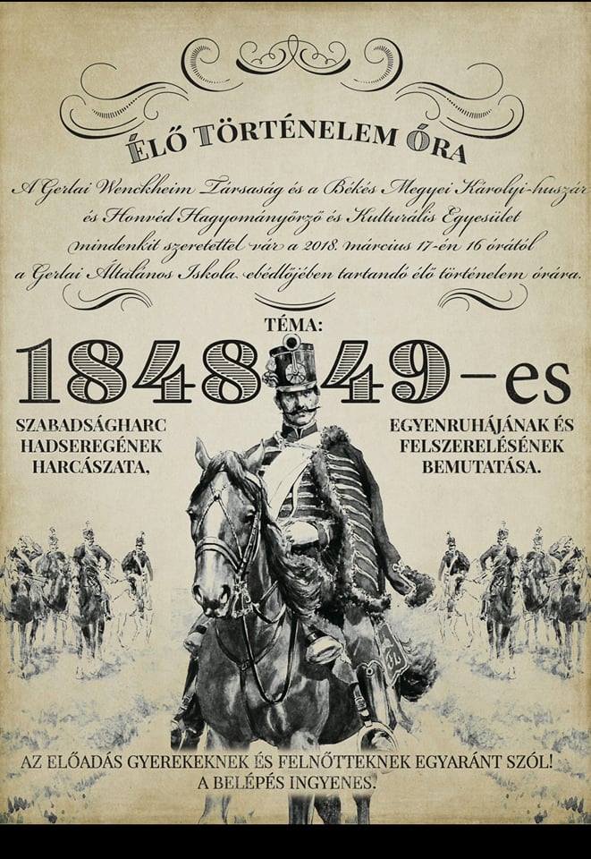 A részleteket lásd a csatolt plakáton. Dátum: szombat, 2018, március 17 - 16:00 Címkék Békés Vármegyei Károlyi-huszár és Honvéd Hagyományőrző és Kulturális Egyesület1848-49-es szabadságharcGerla
