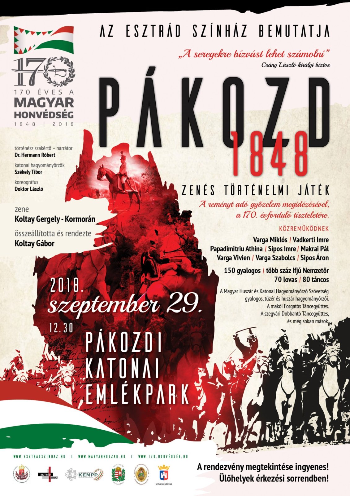 Zenés történelmi játékra invitál minden érdeklődőt a Magyar Huszár és Katonai Hagyományőrző Szövetség és az Esztrád Színház. 2018. szeptember 29-én 12:30 órai kezdettel várjuk vendégeinket a Pákozdi Katonai Emlékparkba, a pákozdi csata reményt adó győzelmének megidézésére, a szabadságharc 170. évfordulója tiszteletére.