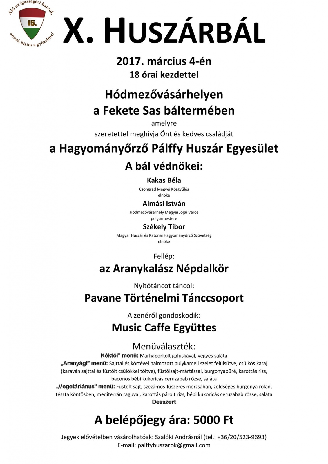 Helyszín: Hódemzővásárhely, a Fekete Sas bálterme Dátum: szombat, 2017, március 4 - 18:00 Címkék Hagyományőrző Pálffy-Huszár EgyesületHódmezővásárhelybál