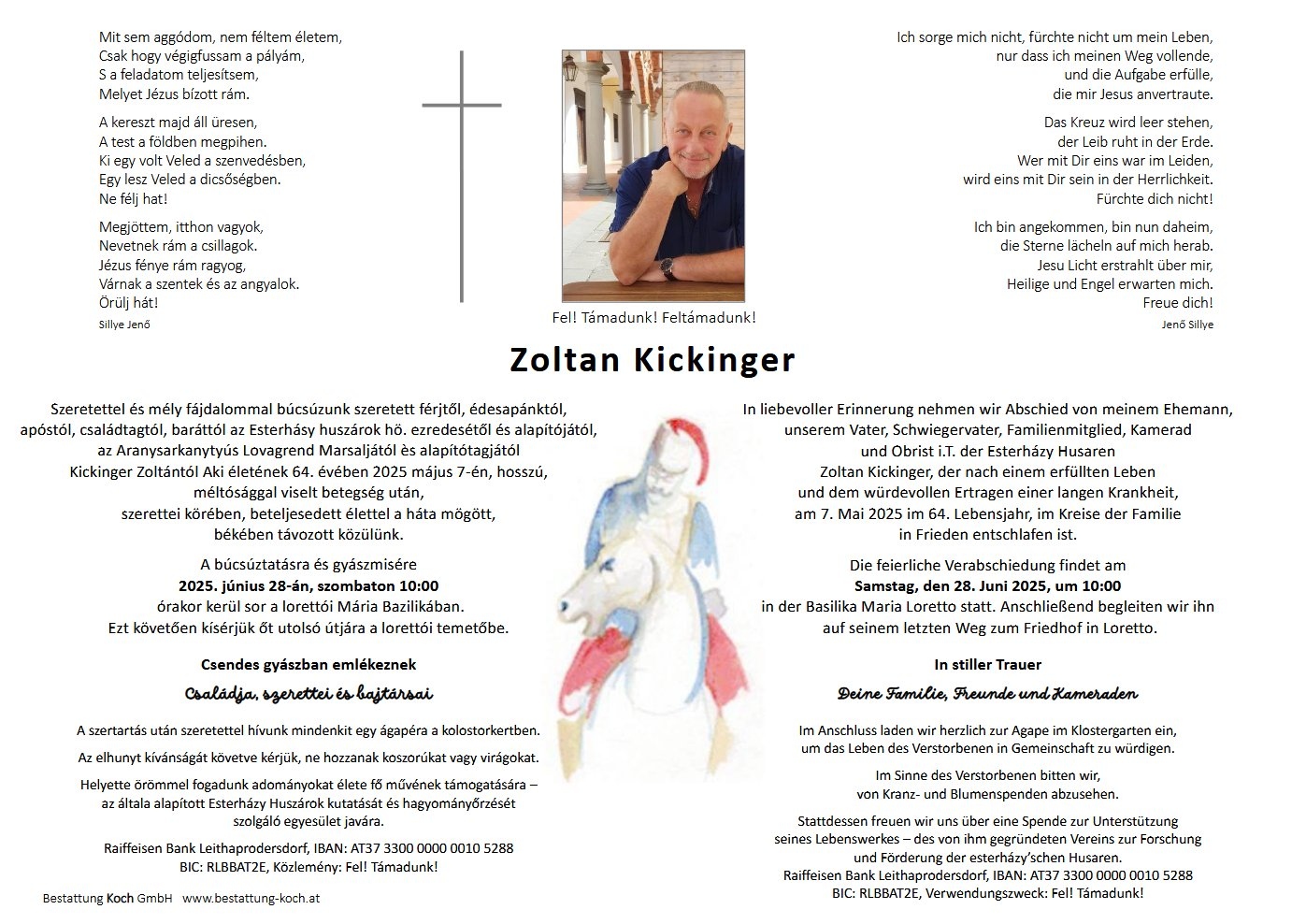 Gyászol a magyar katonai hagyományőrzés, a huszárság és mindenki, aki ismerte és szerette Kickinger Zoltán hő. ezredest, az Esterházy huszárok parancsnokát. Halálával egy igazi lovast, egy nagyszerű huszárt veszítettünk el, aki példamutató életével bizonyított. Megmutatta, miként lehet egyszerre jó családapának, jó magyarnak és a kultúra elhivatott zászlóvivőjének lenni.