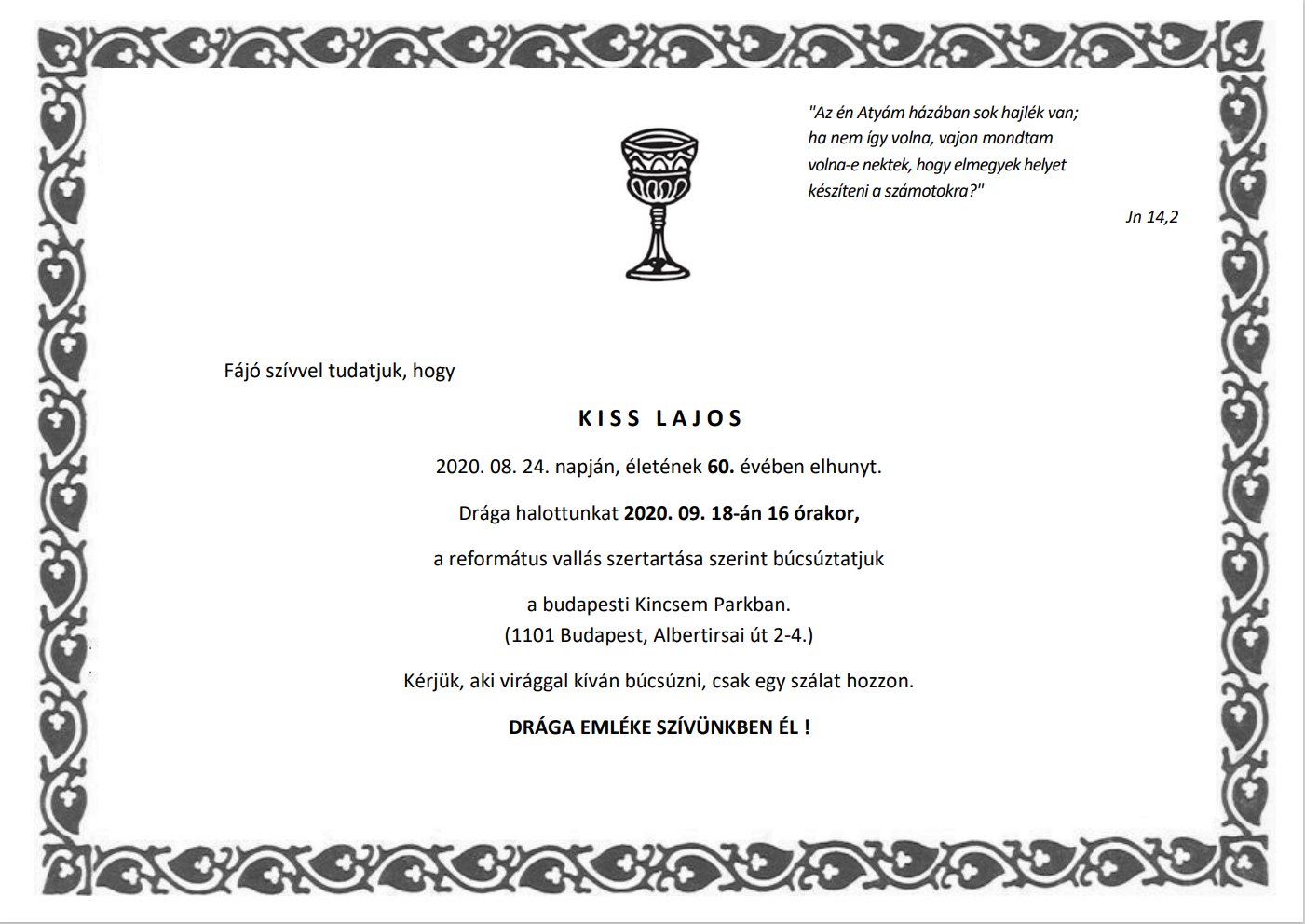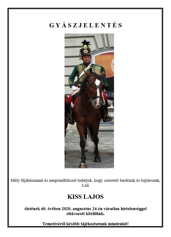 Mély fájdalommal és megrendüléssel tudatjuk, hogy Kiss Lajos bajtársunk, a Történelmi Lovastúra Egyesület tagja életének 60. évében, 2020. augusztus 24-én váratlan hirtelenséggel eltávozott közülünk. Temetéséről az alább láthat gyászjelentésben tájékoztatjuk olvasóinkat.