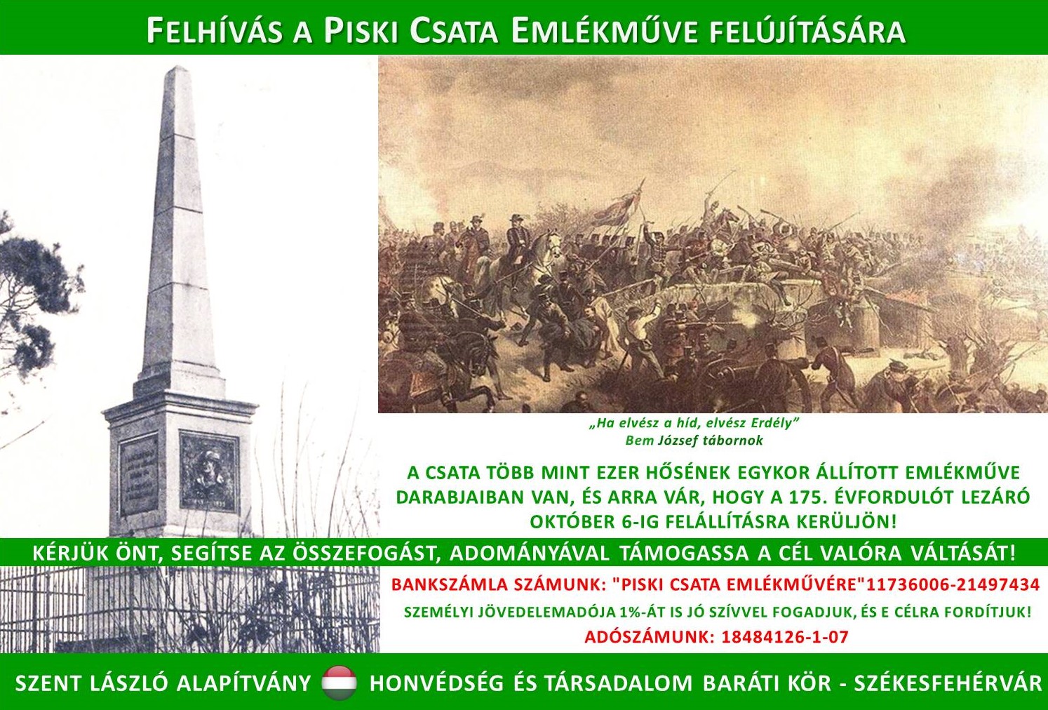 - Felhívás a piski csata emlékműve felújítására. Kérjük mondja el barátainak a nemes célt, hívja fel figyelmüket az adományozásra és kérje fel Őket is a támogatásra!
