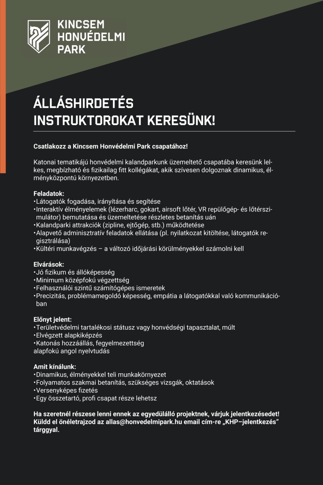 Az alábbiakban osztjuk meg a Kincsem Honvédelmi Park álláshirdetését, melyben instruktorokat keresnek.