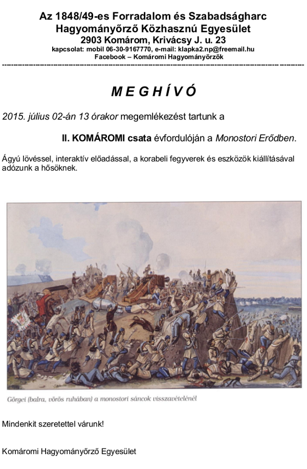 A Komáromi Hagyományőrző Egyesület 2015. július 2-án, 13 órai kezdettel megemlékezést tart a II. komáromi csata évfordulója alkalmából a Monostori Erődben.