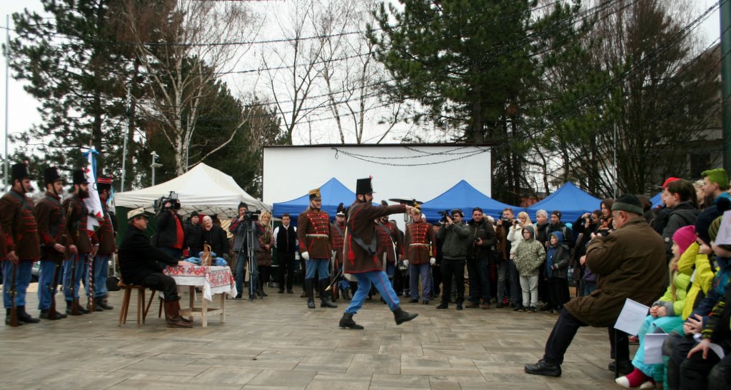Az eseményt toborzással kezdtük. Jánosi Attila honvéd, aki civilben néptánctanár, kardos verbunkkal mutatta be a honvédvirtust, melynek hatására több fiatalember jelentkezett honvédnek. A mustra után a jelentkezők a kisasztalhoz járultak, ahol aláírták a szolgálatot, majd ezért Kossuth-bankókat kaptak és ittak a “király borából”, ami azt jelentette, hogy szentesítették a toborzást, immár három évre elkötelezték magukat honvédnek. Köztük volt Novák Péter színész, a Kultúrházak Éjjel-Nappal rendezvénysorozat arca is, akiről hamar kiderült táncos tudása, úgy ropta a verbunkot honvédünkkel, mintha igazi 48-as toborzó katona lenne. Pétert tüzérnek osztottuk be, gyors kiképzést kapott, hogy felkészülhessen egy önálló lövésre is.