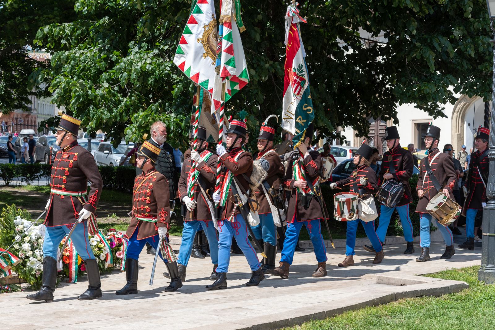 A koszorúzást követően Vesztergám Miklós tárogatós a Boldogasszony Anyánk régi egyházi himnuszt játszotta el, amellyel a 48-as zászlók előtt is tisztelegtünk, hiszen a festett nemzeti címer mellett minden honvédzászlón a másik oldalon Magyarország védőszentje – Szűz Mária a kis Jézussal – kapott helyet. Az ünnepség végén a Kossuth nóta eléneklése után a díszegység a kivonulásnál fordulatot vett és az emlékmű és a törzskar előtt menetből tisztelgett.