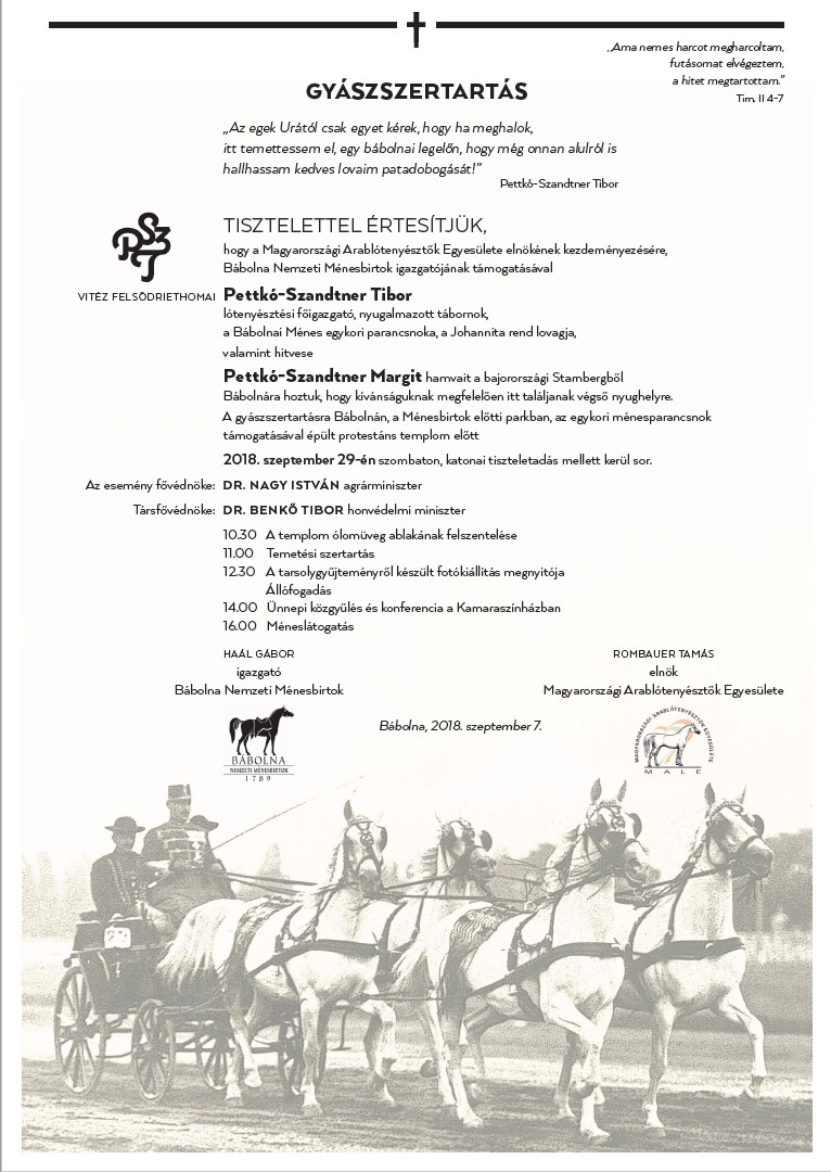 Ezúton értesítünk minden érdeklődőt, hogy a Magyarországi Arablótenyésztők Egyesülete elnökének kezdeményezésére, a Bábolna Nemzeti Ménesbirtok igazgatójának támogatásával vitéz Felsődriethomai Pettkó-Szandtner Tibor lótenyésztési főigazgató, nyugalmazott tábornok, a Bábolnai Ménes egykori parancsnoka, a Johannita rend lovagja, valamint hitvese Pettkó-Szandtner Margit hamvait a bajorországi Starnbergből Bábolnára hoztuk, hogy kívánságuknak megfelelően itt találjanak végső nyughelyre.