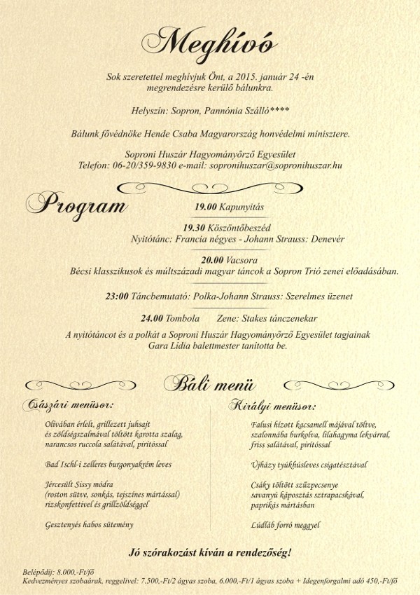Sok szeretettel hívjuk Önt a Soproni Huszár Hagyományőrző Egyesület 2015. január 24-én megrendezésre kerülő báljára. A részletes programot a csatolt dokumentum között tekintheti meg.