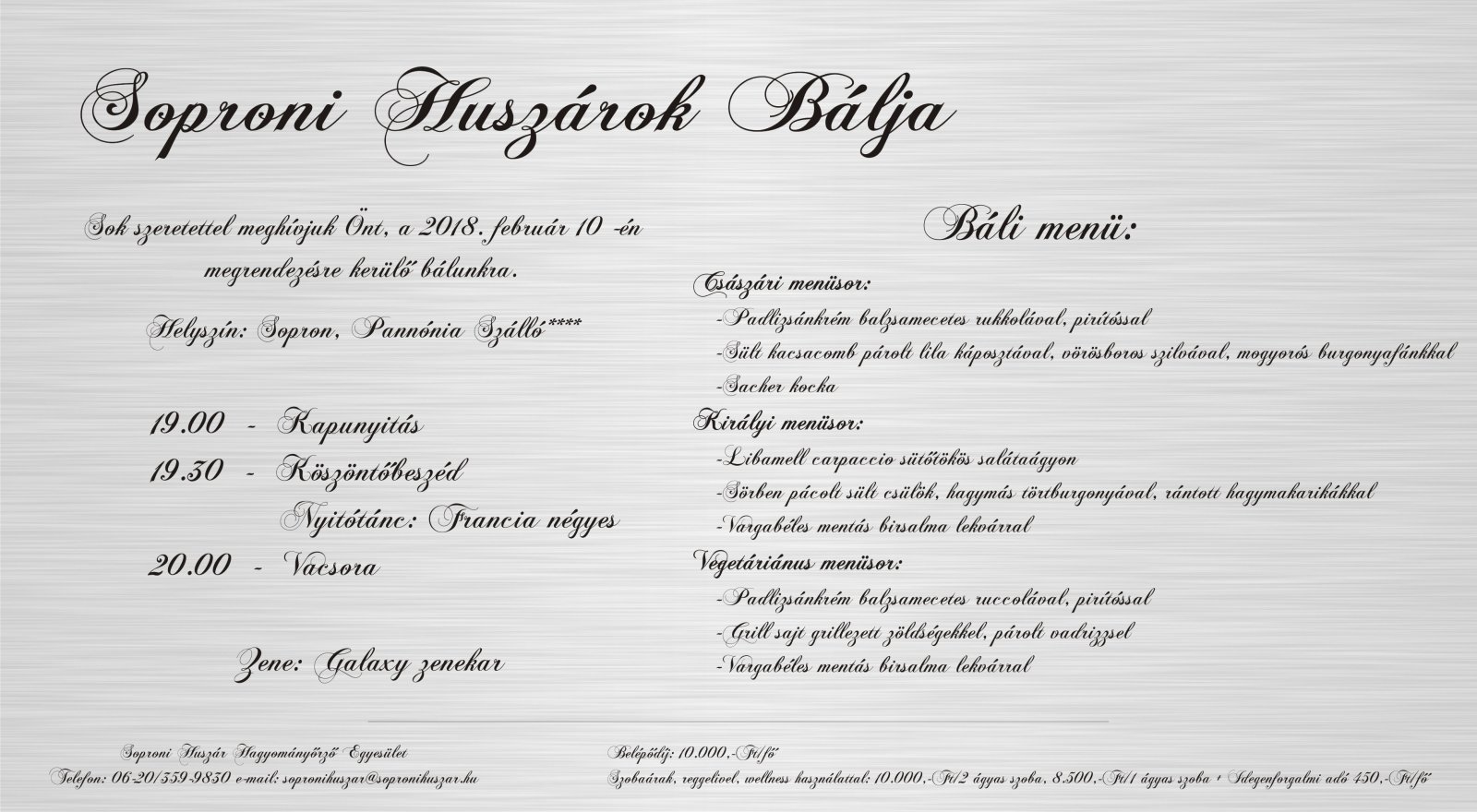A Soproni Huszár Hagyományőrző Egyesület szeretettel invitál minden érdeklődőt a hagyományos Huszárbálra, mely 2018. február 10-én kerül megrendezésre a soproni Pannónia Szállóban. A részletes program, báli menü a lentebb látható meghívóban érhető el.