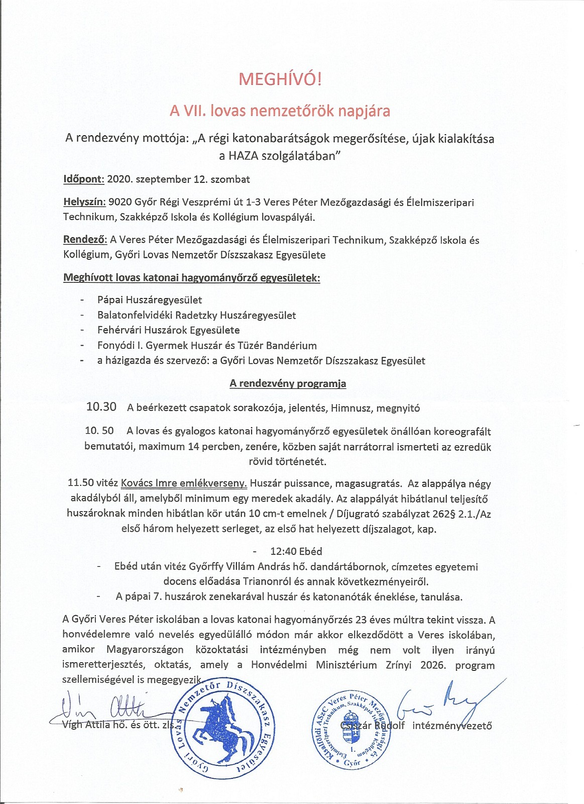 A Győri Lovas Nemzetőr Díszszakasz Egyesület elnöksége nevében tisztelettel invitálom a tagságot és a huszár bajtársakat 2020. szeptember 12-én, szombaton a VII. Lovas Nemzetőrök Napjára. Részvételi szándékát az ebéd miatt kérem, hogy mindenki előre jelezze.