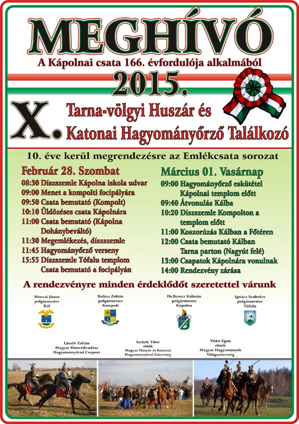 Minden érdeklődőt szeretettel várunk a Kápolnai csata 166. évfordulója alkalmából megrendezett X. Tarna-völgyi Huszár és Katonai Hagyományőrző Találkozóra.