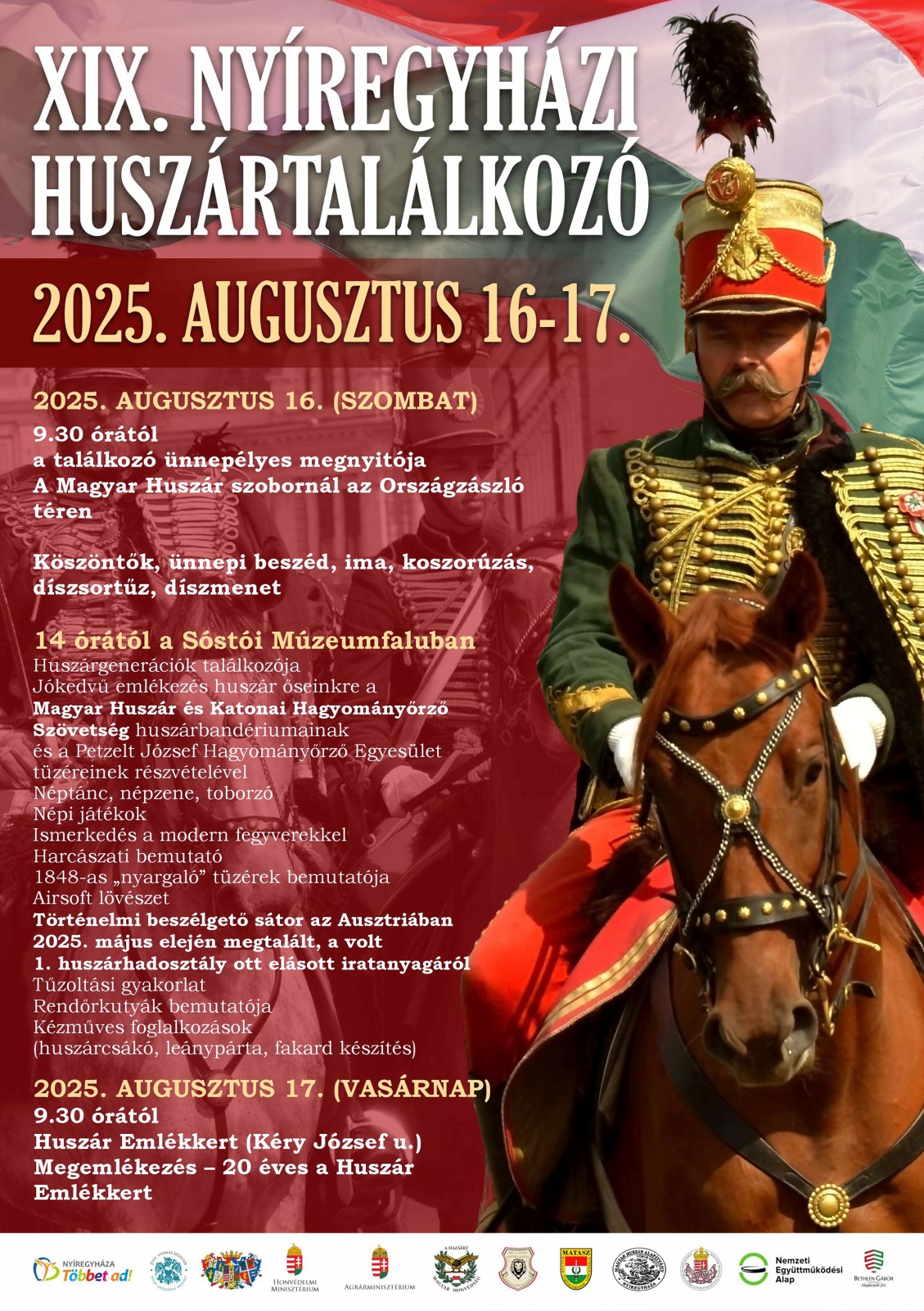 Augusztus 16-17-én vehetnek részt az érdeklődők a XIX. Huszártalálkozón Nyíregyházán. A délelőtti ünnepélyes megnyitóra a Magyar Huszár szobornál, az országzászló téren kerül sor. A program délután a Sóstói Múzeumfaluban folytatódik. A részletes program a mellékelt plakáton olvasható.